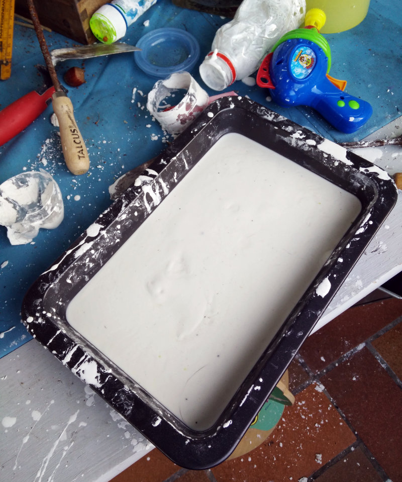 Dafür hat er sämtliche verfügbaren Stärkereserven mit etwas Wasser vermengt und probiert, das Resultat auf verschiedenste Art zu verwenden. Zum Beispiel in der abgebildeten flachen Wanne. Oder in einem Becher. Oder in einem Luftballon als Stressball.