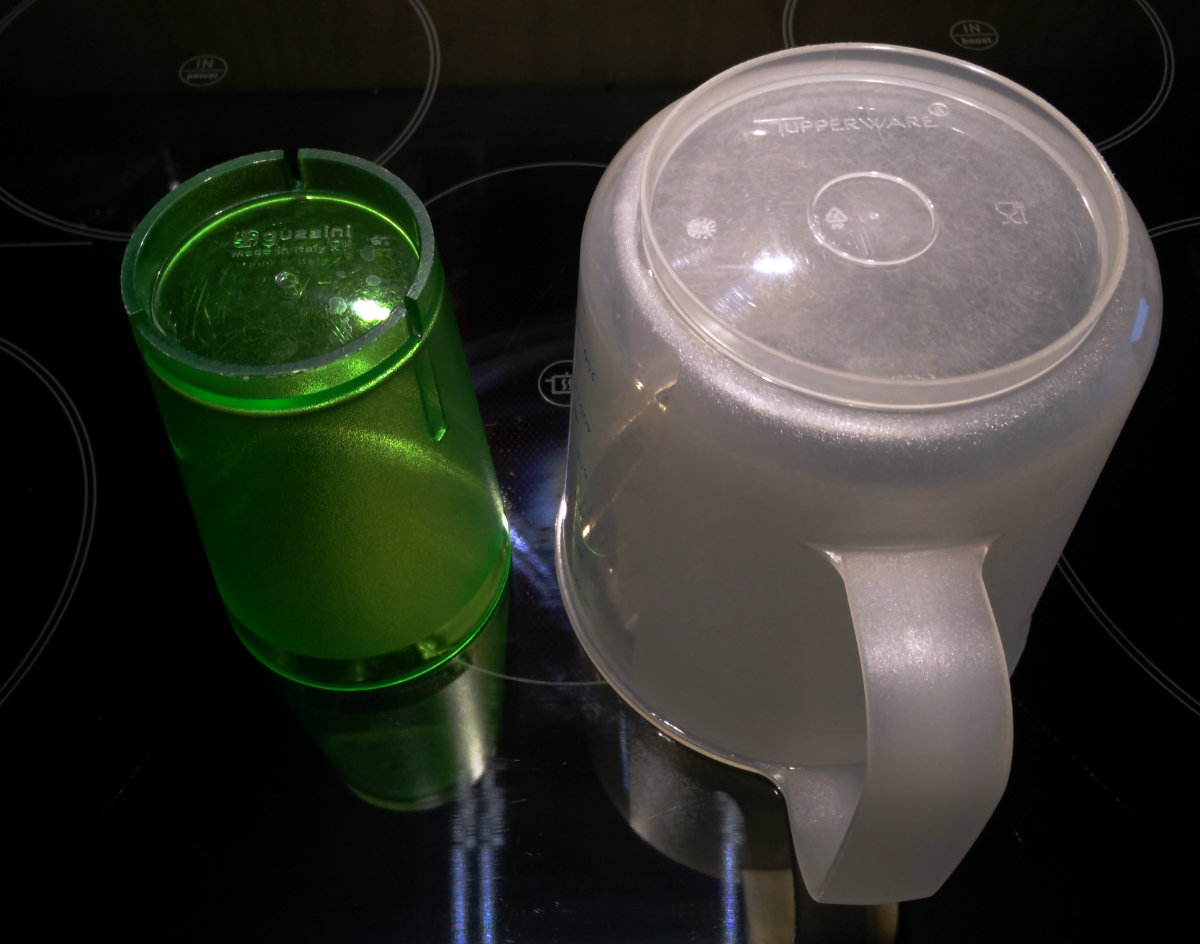 Früher™, als bekanntlich alles noch besser war, gab es Kunststoffdinge von Tupperware®, die sich zum Einen durch ihren Preis und zum Anderen durch ihr durchdachtes Design von der Masse abhoben. Das mit dem Preis ist auch heute noch so, aber für so etwas wie die aktuellen Mess-/Rührbecher (rechts im Bild) wäre früher sicherlich der verantwortliche Mitarbeiter fristlos an die frische Luft gesetzt worden.