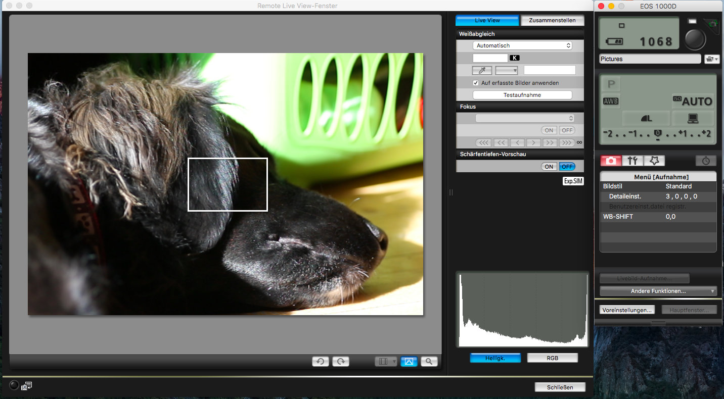 Man kann tatsächlich ziemlich viele Kamerafunktionen per Mausklick steuern. Obergenial ist (wie ich schon gehofft hatte) die Beurteilung der Schärfe auf dem großen Bildschirm. Ich glaube, damit kriege ich meine Makrofotos besser hin.