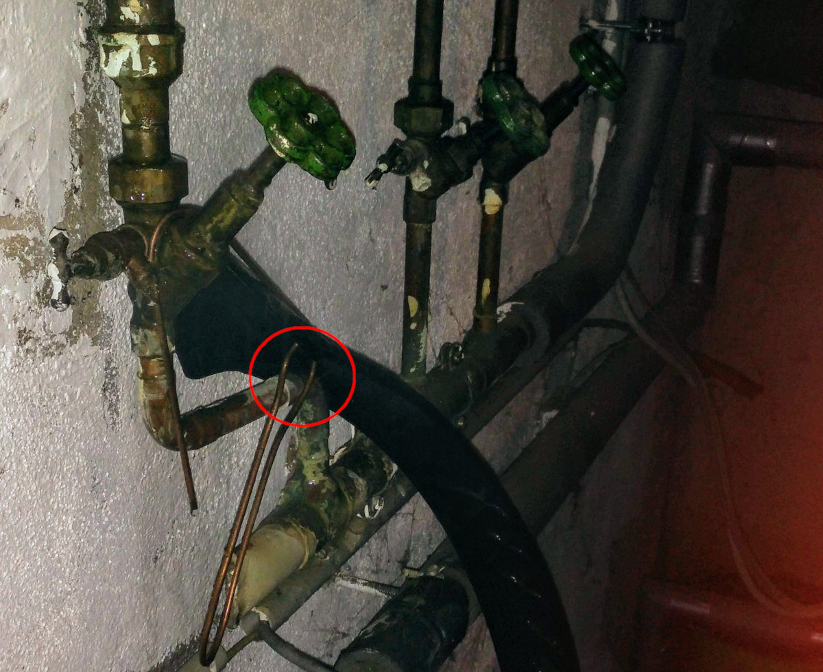 Am 27. Dezember kam morgens die Schwiegermutter zu uns und meinte dass der Keller „wieder“ unter Wasser stehe (Anm. d. Red.: vor ziemlich genau einem Jahr stand der Keller unter Wasser, weil im Kontrollschacht vor dem Haus die Suppe stand weil die Leitung zwischen Kontrollschacht und Abwasserkanal nicht mehr viel durch gelassen hat). Nach eingehender Untersuchung stellte sich heraus, dass dieses Mal das Abwasser nicht die Ursache sein konnte. Vielmehr sah der Heizungskeller aus wie eine Mischung aus Dampfbad und Tropfsteinhöhle. Die aufgehängten gewaschenen Kotzklamotten troffen vor Nässe, von sämtlichen Leitungen an der Decke tropfte das Wasser. Um die Ursache zu finden, war etwas Detektivarbeit notwendig. Letztlich fanden wir heraus, dass wir ein Leck in einer Heißwasserleitung hatten. Ein Kupferrohr-Bogen war nach über 40 Jahren Dienst regelrecht von innen ausgewaschen.