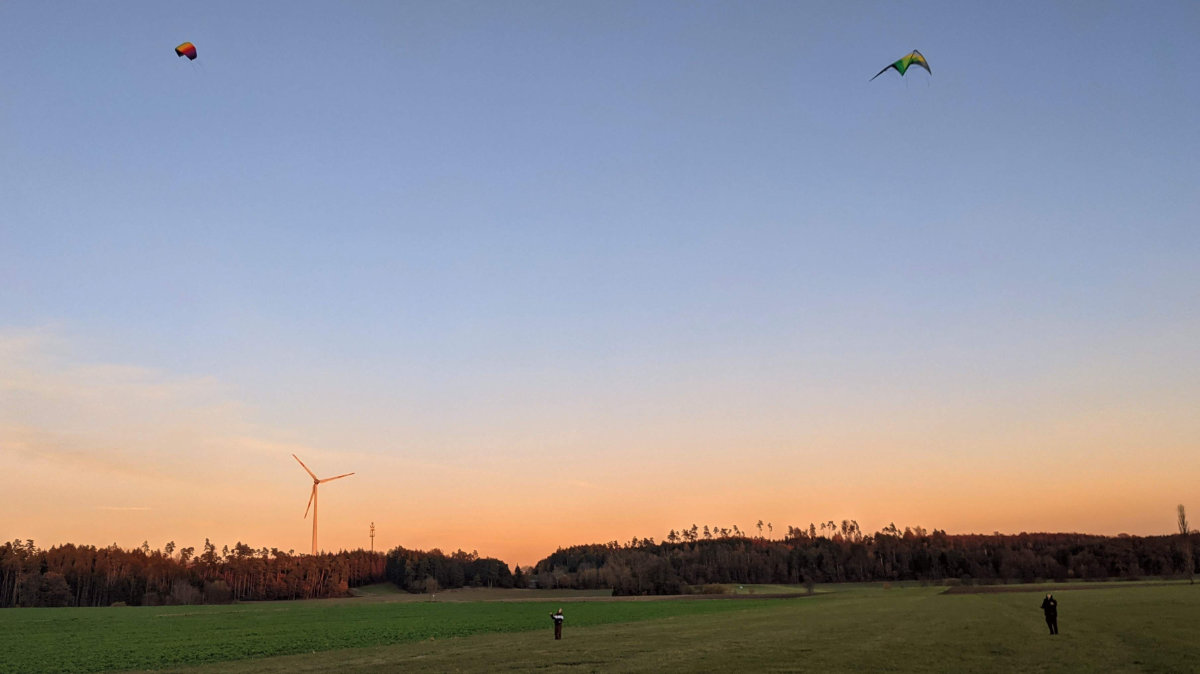 Jetzt können wir mit mehreren Lenkdrachen gleichzeitig auf Tour gehen; ich habe mir zu meiner Lenk-Matte noch einen “echten” Drachen gegönnt (oben rechts im Bild).